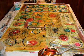 Last weekend I managed to squeeze in a few minutes to revisit the last piece of fabric on which I was working. On December 29th it looked like this on the print table.