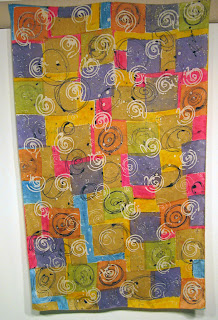 Finally, I had a "cute" piece of batik from last December that looked rich on the print table, but lost a lot of the dye in the washout. Here's the link for my December 29 posting that shows it in process. I don't have a picture of the faded version, but just image all those strong colors going pastel. The image below shows what happened with some deconstructed printing over top. I like where this is going, but I'm not sure what comes next.