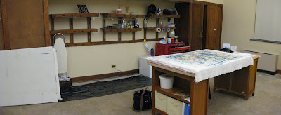 Here's a panoramic view of my new studio. It's huge--really huge! I moved in today with help from Dan and our friend Mary Frances. It was a long tiring day but with three people we really seemed to make quick work of it. I went back this evening for a couple of hours and got dye concentrate mixed so I should be in business tomorrow.