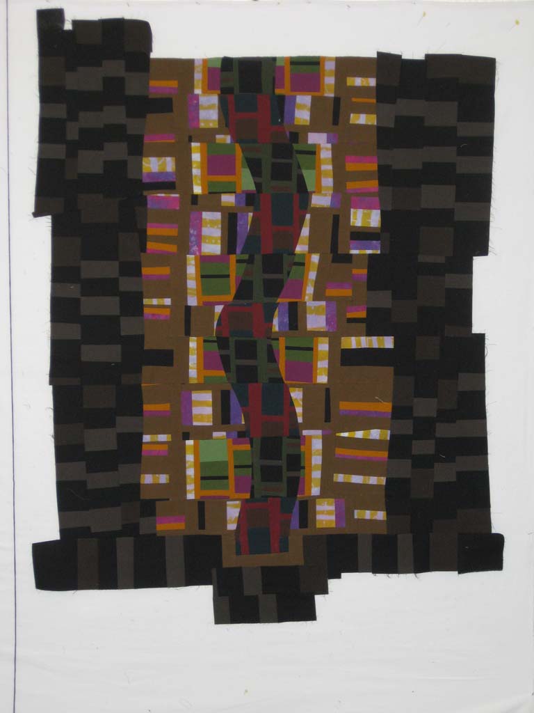 As I began to assemble it I realized that the little piece of the curved middle strip that was extending below the rest of the design was something to which I'd become attached. From the purely practical perspective of construction, this was not the best time to come to this realization because it meant even more seam ripping than I was already doing, not to mention scavenging through the scrap pile in search of bits of fabric that I was out of.
